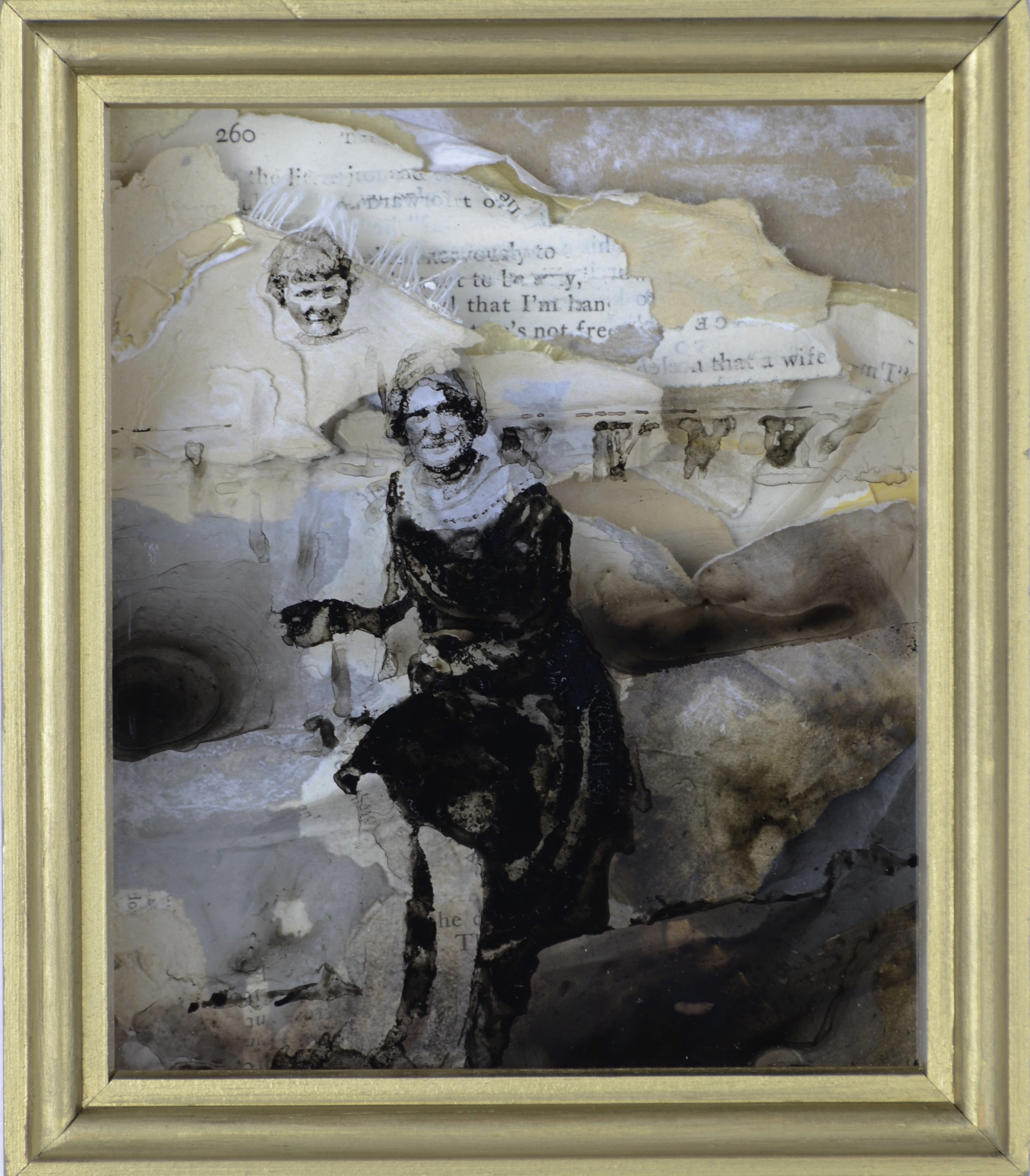 First, an image inspired by the photograph was hand-painted in ink on the reverse side of the frame's glass. Next, pieces of nature, torn paper, cloth, thread, books, etc. were pieced together on the frame's backing to add texture and dimension.